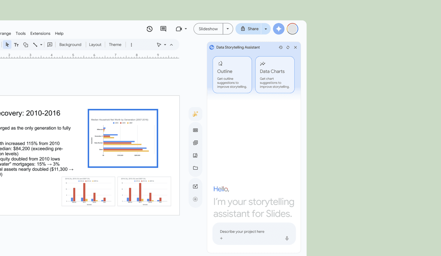 Collaborating with Google Slides to build an assistant for students to tell their data stories.