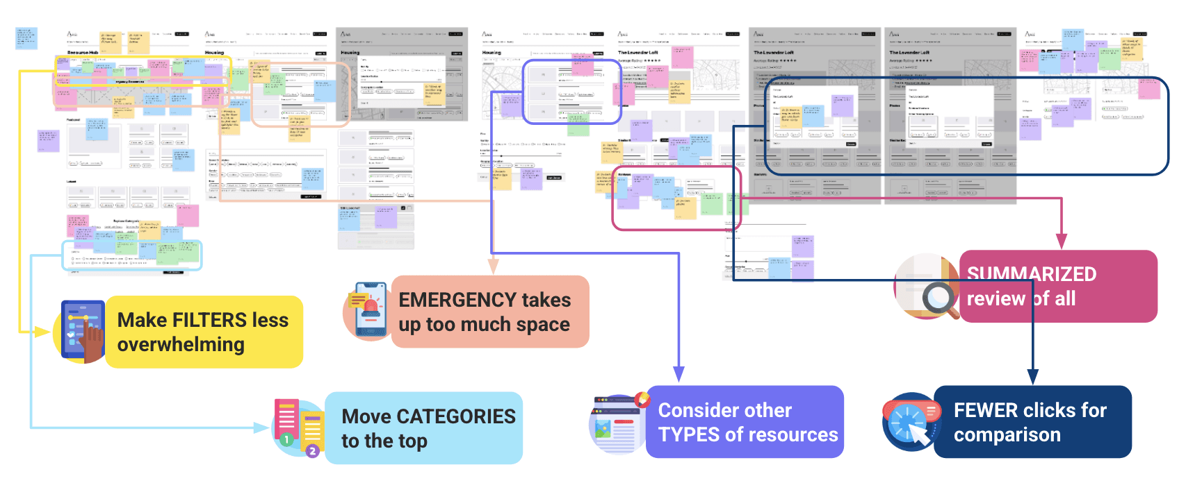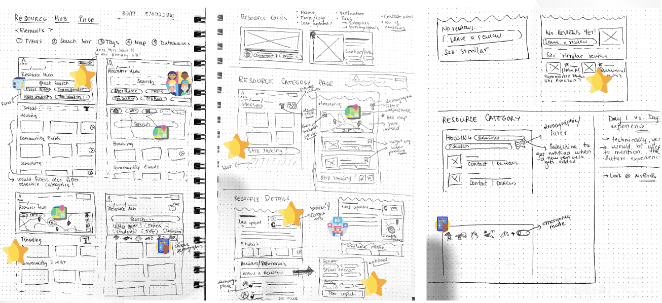 Building the IA, validating it and hosting co-ideation sessions, I led the design of the hub that addresses intersectionality and offers trust designing for the users with the users.